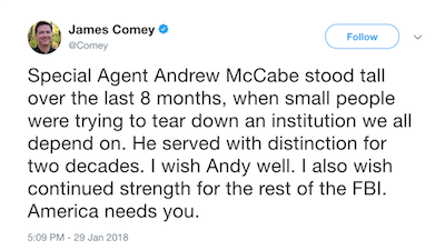 …in support of the disgraced, fired former FBI deputy director of the FBI. Does Comey really believeanyone is the least bit interested in anything he thinks or says?!? If so, he’s as blinded by his ego as Brennan and Clapper.