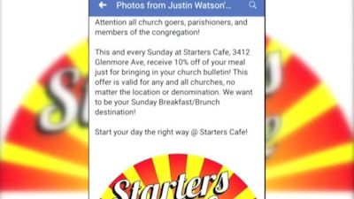 “…The owners of the Starters Cafe in Cheviot, Ohio, offered a 10-percent discount to those who presented that morning’s church bulletin at Sunday brunch…Watson said there are at least seven churches within a mile of the restaurant and felt this would be an easy way to get more people in the door…Watson, who opened the restaurant the first week of June, said the response was positive – at first.