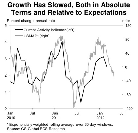 This may be as good as it gets. Sputter-speed growth of around 2% and a moribund labor market. As the above chart suggests, the recovery is losing momentum. Here’s Goldman economist Jan Hatzius: