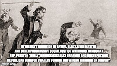 For those unfamiliar with the significance of Brooks’ attack on Sumner, it was in response to a rather fiery speech given by the Massachusetts Senator two days earlier in which he sharply chastised slave owners, including a relative of Brooks. Bully Brooks, quite literally, beat Sumner within an inch of his life; and the event, which elicited a particularly polarized response from the American public, is considered emblematic of the “breakdown of reasoned discourse” which ultimately led to the War Between the States.