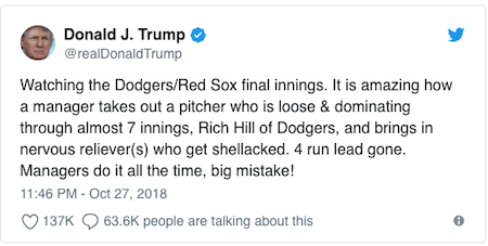 That being said, we’re in agreement with the Dodgers’ Rich Hill when he defended Manager Dave Roberts’ decision to pull him in the sixth inning of Game 4 of the World Series against Trump’s Monday-morning quarterbacking…