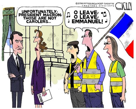 “Maybe Donald Trump should export red MAGA caps to France and the United Kingdom. Make France Great Again. Ditto England. The photos this week of a shell-shocked Emmanuel Macron and beyond-beleaguered Theresa May show what a heavy lift renewed greatness has become for once-great nations.(Let’s not forget Angela “Asylum” Merkel!) How come?