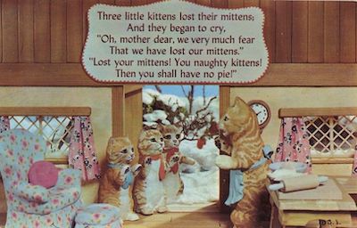 Editor’s Note…if you’ll allow us to digress a moment: For those too young to have been read the story of the Three Little Kittens, we were privileged not only to have enjoyed our dear, departed Mother recount their tale of woe to us, but also to her three dear grandsons, our boys. We can still hear her emphasis on the appropriate lines…and imagine she’s still with us. A dream which will be realized when we hug her again in Heaven.