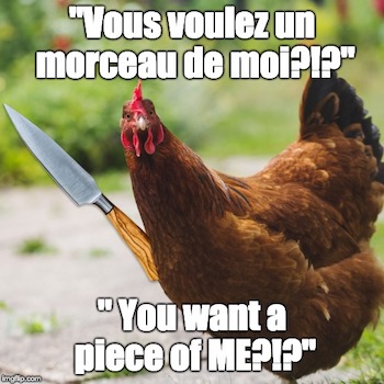 …large talons; and, (2) welcome to France, the only country we know where the chickens are the only ones who fight!