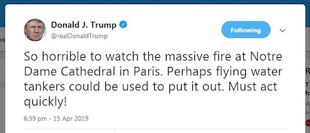 Seriously, when a simple, “America grieves with France in the tragic loss of this irreplaceable piece of history” would have sufficed, Trump felt obliged to not only offer Paris first-responders advice on combatting the blaze, but urge them to haste. This from a man whose only experience with fire has likely been lighting a cigar; he literallycannot help himself!!!