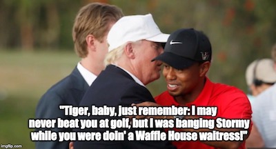 Holy “Birds of a Philandering Feather Flocking Together”, Batman! Hey, Tiger’s The Donald’s kind of guy. As Daniel Francis Feeney so insightfully noted, this is just another sign of where we’re at as a country; we’re not serious.