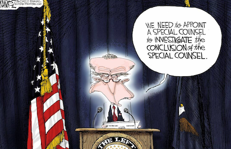 The smear-but-don’t-charge outcome is the result of two wrongs: (1) Mueller’s dizzying application of Justice Department guidance, written by the Office of Legal Counsel (OLC), holding that a president may not be indicted while he is in office; and (2) the media-Democrat complex’s demand that only laws they like — those that serve their anti-Trump political purposes — be enforced…”