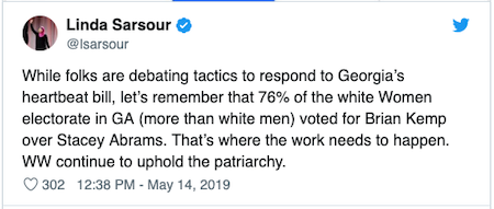 So, at least according to the creature wearing the Muslim head scarf, White women…which in Georgia means CHRISTIANWhite women…are upholding the patriarchy. Makes sense to us, as we all know how Islamempowers…