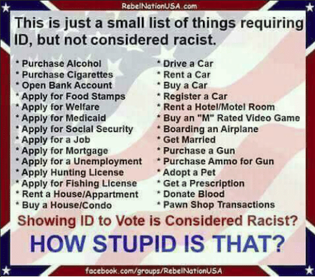 And if presenting a photo ID at a polling place truly constitutes an undue burden on “people of color”, we’re forced to wonder how they’ve managed thus far to live…