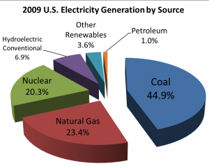 The federal Energy Information Administration reports that in 2009 “the 4% drop in the carbon intensity of the electric power sector, the largest in recent times, reflects a large increase in the use of lower-carbon natural gas because of an almost 50% decline in its price.” The Department of Energy reports that natural gas electric plants produce 45% less carbon than coal plants, though newer coal plants are much cleaner.