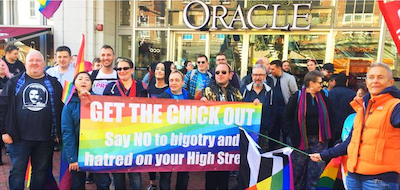 Protestors swarmed The Oracle shopping center on Saturday holding a sign saying “GET THE CHICK OUT Say NO to bigotry and hatred on your High Street.”
