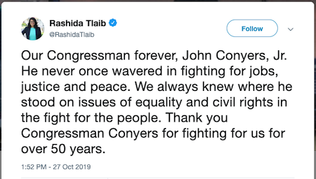 Though his history of sexual predation and rampant corruption didn’t prevent Rashida Tlaib from singing his praises:
