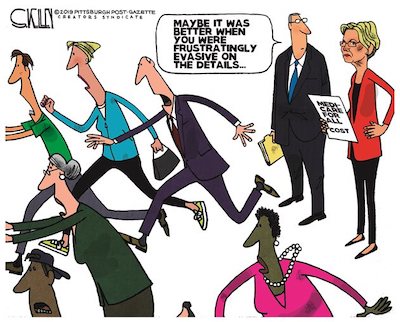 ...Which is why the identity of the Democratic nominee matters. A study by the Public Religion Research Institute in coordination with Brookings found that one third of Americans say their vote will depend on the winner of the Democratic primary. These uncommitted voters identify as moderate and politically independent. They don’t like Trump, but may wind up in his column if the Democratic nominee strikes them as immoderate.(Gee, given the current crop, what are the chances of THAT?!?)A Democratic nominee whose agenda is out of step with the public would be exactly what Trump needs to increase his support among his base and reclaim lost ground among independents and white voters with college degrees.