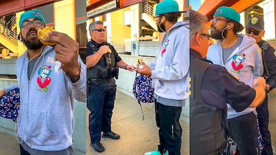 But not at police cuffing a commuter with attitude (you can watch the entire, unedited video here, but keep in mind it begins after the initial confrontation) for violating a civic ordinance designed to maintain the cleanliness of the BART system.