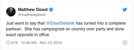 Dowd and others criticized Stefanik for succumbing to partisan loyalties in response to her questioning of the impeachment witnesses.“She has campaigned on country over party and done exact opposite in office,” Dowd tweeted.“