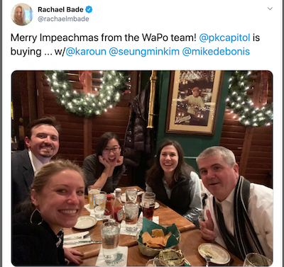 A fact which likely pierced even the alcohol-addled brain of Rachael Bade, as her tweet showing the group of WaPo “journalists” who moonlight as CNN pundits celebrating was quickly deleted.