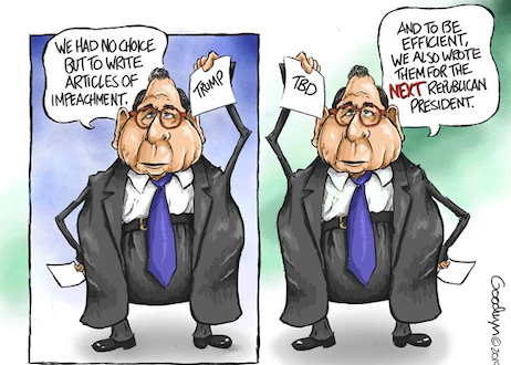 Second, for those of you without the time to watch Mitch McConnell’s Senate speech following the conclusion of the House’s kangaroo court in its entirety, here’s a clip which catches the substance…