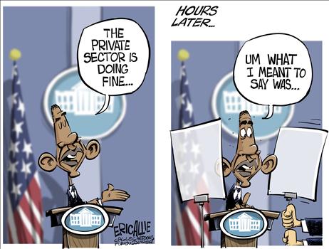 In his news conference last week, Obama argued that the private sector isn’t holding back the economy, the public sector is — hence “the private sector is doing fine.” When given the opportunity to retract his gaffe, he basically repeated it. “It’s absolutely clear that the economy is not doing fine,” the piqued president said. “That’s the reason I had the press conference.” (Something’s wrong when you have to explain why you had a press conference.)
