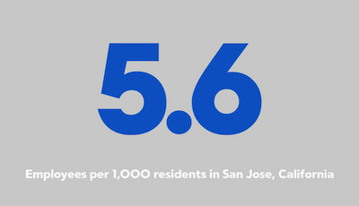 Take a look at the attached chart from San Jose, California. As you can see, San Jose had an average of 7.5 employees per 1,000 residents from 1986 to 2005, and never dropped below 7.0. But in the last two years, that ratio has cratered — to 5.6 per thousand this year, with further cuts expected next year.
