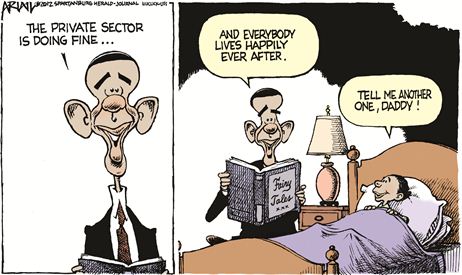 Listening to President Obama’s defenders spinning his claim that the “private sector is doing fine” reminded me of those kids and their dad, all afraid to admit everything’s not fine.