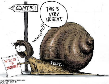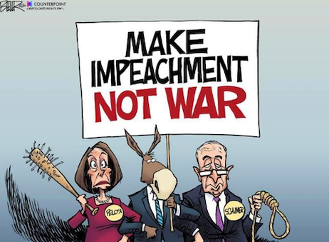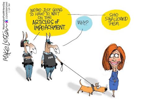 “…Pelosi knew that opening an impeachment action against President Donald Trump was a dumb idea, because simply talkingabout impeachment would offer about 90 percent of the political benefit with none of the risk, whereas actually impeaching the president offered only a near guarantee of final failure. The point of this impeachment is not to remove Trump from office — everybody knows that is not very likely to happen — but to denounce him.(As if The Donald would be anything but empowered by denouncement!) Democrats victimized by wishful thinking may have believed that the testimony in the House and the howling 1,000-coyote chorus in the media would turn some Trump voters against him, but, if anything, both will have the opposite effect, giving the president the two things his style of politics most needs: a narrative of unfair victimization and an opportunity to proclaim victory. Trump is not a statesman but a culture-war WMD, and his admirers are not much interested in any kind of disarmament, and in unilateral disarmament least of all…“