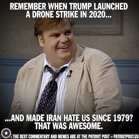 Third, does anyonereally believe, Trump’s “eagerness to take credit” being unapparent to anyone other than Pollack, had the Iranians been able to breach the defenses of our Bagdad embassy, they’d have just painted a few “Death to America” slogans on the walls, then voluntarily vacated the premises?!?
