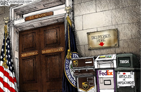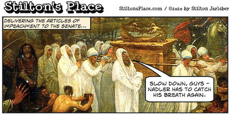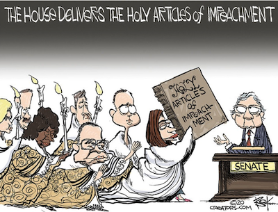 It’s Monday, January 20th, 2020…but before we begin, a correction is in order: Adam Schiff-for-Brains was indeed named one of eight House impeachment managers. Our initial impression Pelosi had named six House managers, and Schiff was not among them, was a regrettable error. Word is now Nancy may want Eberhard Adam in the Senate chamber so as preclude his being called as a witness. More as events unfold.
