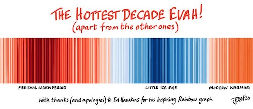 “…A couple of years ago, Ed Hawkins came up with idea to make a meme-style temperature art piece for the graph-challenged.I’ll have to say that it was brilliant, because serial regurgitators all over the world shared the hell out of it.They even gotTV weather people to wear tiesdepicting it.