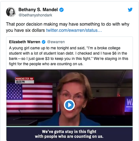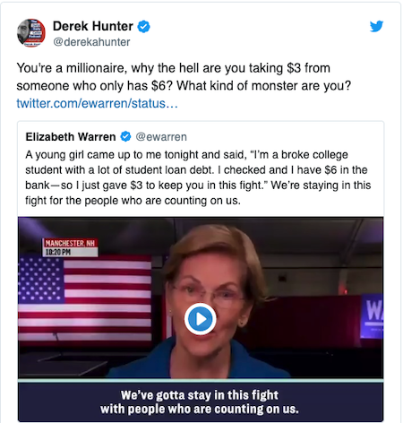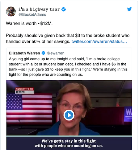 It’s Friday, February 14th, Valentine’s Day 2020…but before we begin, three observations on Lieawatha’s claim a broke girl donated half her liquid cash reserves to indulge this horrid harpy’s unbridled ego and further her blind, boundless ambition: