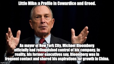 Little Mike Bloomberg: just another brick in the wall of the basest sort of avarice and greed which enabled Xi Jinping and the ChiComs to loose the Peking Plague upon an unsuspecting world.