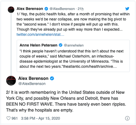“It is worth remembering in the United States outside of New York City, and possibly New Orleans and Detroit, there has BEEN NO FIRST WAVE. There have barely even been ripples. That’s why the hospitals are empty,” he tweeted…”