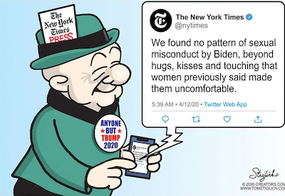 For all their lectures to the public about transparency and fearless independence, prestige journalists tend to be very reluctant to face accountability of their own. Ben Smith, who only recently left his position as editor in chief of BuzzFeed (Now THAT’s a position of journalistic moral authority!!!) for a perch as media reporter for the Times, deserves credit for putting Baquet to some tough questioning. Let’s walk through the Times’ very belated reporton the Biden allegations and Baquet’s defenses of that reporting. The article, blandly titled “Examining a Sexual Assault Allegation Against Biden,” ran on A20 of the Easter Sunday edition of the paper. On the same day, the Times opinion page ran a much more visible op-ed by Biden himself on his proposals to reopen the country.