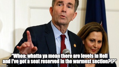 Here’s the juice: If there are levels in Hell (a concept to which we’re…warming!), Ralph Northam and his fellow advocates of infanticide who’ve created and perpetuated Progressivism’s culture of death will certainly occupy a level far closer to the furnace than the likes of…