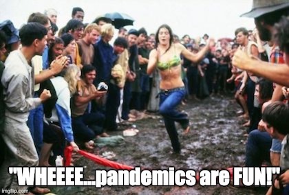 Nothing closed. Schools stayed open.All businesses did too. You could go to the movies. You could go to bars and restaurants.John Fund has a friend who reports having attended a Grateful Dead concert. In fact, people have no memory or awareness that the famous Woodstock concert of August 1969 – planned in January during the worse period of death – actually occurred during a deadly American flu pandemic that only peaked globally six months later. There was no thought given to the virus which, like ours today, was dangerous mainly for a non-concert-going demographic.