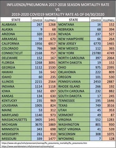 We personally checked both links, and the figures are correct, at least for the 2018 flu fatalities; as we all know, the numbers of deaths due to the Wuhan virus have been, in many if not most cases,…”inflated“. Truth is, if today a man jumps off the Empire State Building or is hit by a train, and the corpse was found to contain the faintest traces of the Peking pathogen, his death will be ruled as Wuhan-related. Why, inquiring minds want to know? Because, in the case of…