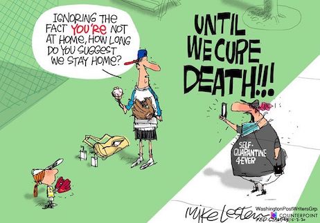 Here’s the juice: as our EMT eldest and his ER-nurse wife recently observed, while any death is a tragedy, the probability a minimal number of lives will be lost due to seatbelts isn’t sufficient grounds for not mandating their use. Likewise, knowing it’s inevitable some number of otherwise healthy individualsunder the age of 65 will die as a direct result of the Wuhan virus no matter WHAT we do should lead us to quarantine only the obese and elderly (particularly those with underlying health conditions, the vast majority of who don’t work anyway) while the rest of us restart the economy, thus ensuring the availability of future funding for the care of the quarantined!!!