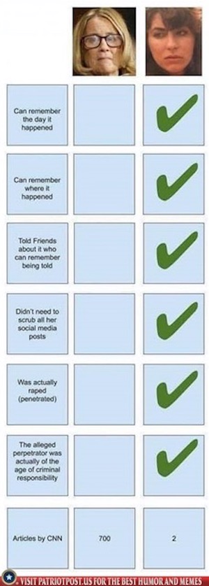 Of course, none of the above is dispositive or unequivocal evidence of sexual assault on its own. We can neverreally know. But the notion that Ford is a more credible accuser than Reade doesn’t stand up to even the most basic examination. It’s just a flimsy excuse for hypocrisy.“