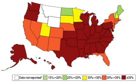 When considering non-Hispanic white adults, zero states had a prevalence of obesity of 35% or greater. However, for non-Hispanic black adults, 28 states and the District of Columbia reported that 35% or more of the demographic is obese.