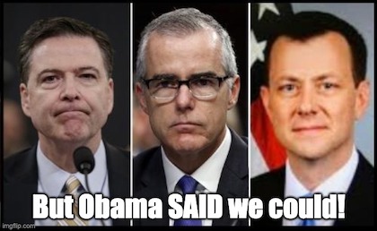 Keep in mind the FBI cannot begin to investigate anyone, especially a U.S. citizen or entity, without first creating a document that lists the reasonably suspicious factors that would legally justify the investigation. That’s FBI 101, taught Day 1 at the FBI Academy at Quantico, Va.(Maybe Strzok was out behind the latrine playing pocket pool that day!)