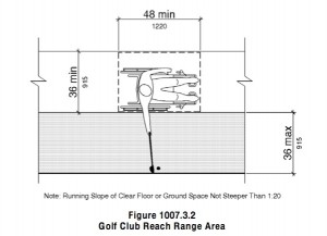The 2010 ADA standards for Accessible Design require that at least 50 percent of golf holes on miniature golf courses be “accessible” – with a ground space that is “48 inches minimum by 60 inches minimum with slopes not steeper than 1:48 at the start of play.”