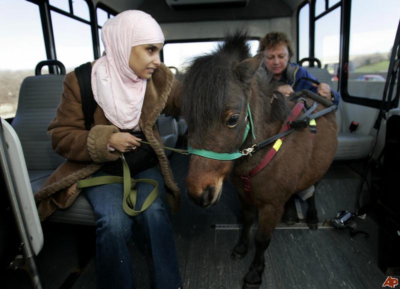 Mona Ramouni, who is blind, rides a bus to work with her guide horse in Lincoln Park, Mich. Growing up in Detroit, Ramouni could never get a dog because her devout Muslim family considered dogs unclean. (We’re left wondering if the Torah or the Bible deemed dogs unclean whether Jews and Christians would have been shown the same deference?)