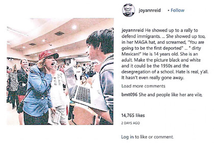 Sandmann is pursuing litigation against Twitter, too, which raises a different issue. Under current law, companies such as Twitter and Facebook are not legally responsible for third-party libels published on their sites. (They are liable for any libel of their own making.) That seems to me the right way to do things, but that does not mean that Twitter should be considered a free for all. Joy Reid of MSNBC is being sued — rightly, in my view — for her smearing of California immigration activist Roslyn La Liberte on Twitter, falsely putting racist words in her mouth with what can only be described as “reckless disregard for the truth” at best.The account offered by Reid is flatly denied by witnesses. False and obviously defamatory: Reid should face a very heavy judgment.