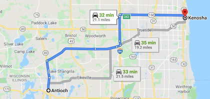 FYI, Antioch, Illinois is only 21.1 miles from Kenosha, significantly less as the crow flies.