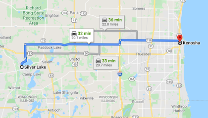 Silver Lake, is 20.7 miles from Kenosha, further than Antioch in a straight line.
