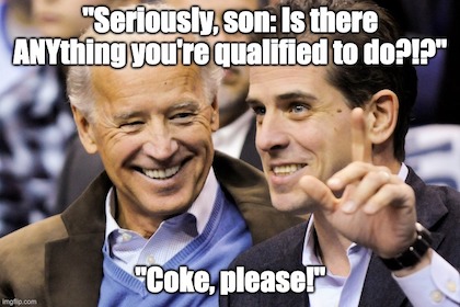 Sperry’s compilation of Hunter’s “business” career is incredibly comprehensive, and well worth perusing; but if you’re pressed for time, it boils down to this: every “job” Hunter’s had was solely as a result of his father’s influence. And yet we’re to believe Joe somehow remained ignorant of his son’s business dealings? Sorry, but wouldn’t any father with ason like Hunter at least wonder how the dirtbag druggie was making a living?!?