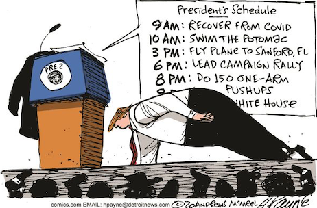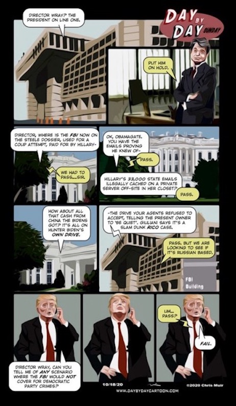 “The American Federation of Trump-Haters and Never-Trumpers have arrived again at their quadrennial promised land: Trump is finished, a wounded monster lurching about, baited by his innumerable enemies, lashing out mindlessly in all directions. His COVID-19 experience is a gift from God; the diligent lackey Bill Barr is a whipping boy for the long-promised Durham indictments’ non-appearance; raving and interrupting good Joe Biden in their debate has backfired; all the self-serving blowhardism is just miring him deeper in the quicksand as he sinks inexorably out of sight. The Trump era will soon be just a bad dream as the Democrats and their look-alike Republican extras regain control and the 90 percent of the federal bureaucracy that is monolithically Democratic sees off another crusading yokel who came to drain their swamp. What a relief that this horrifying aberration is finished and can go back to being someone we laugh at and poke with sharp sticks, as we move the state slowly to the left, addicting more and more Americans to the munificence of America in its endless quest to be cleansed of its white superiority and capitalist avarice.