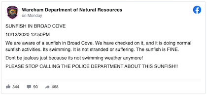On Monday, after police received numerous calls about the sunfish in Broad Cove, the Wareham Department of Natural Resources posted on Facebook asking residents to stop reporting it…“We get it,” he said.“But 911 isn’t a good avenue to report fish that are swimming around.”“