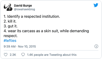 “Twitter user David Burge provided one of the finest, and most succinct, descriptions of modern leftism in a brief tweet back in 2015.