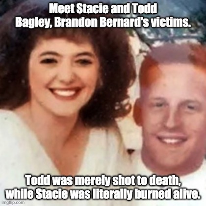 Vialva shot both Todd and Stacie in the face, killing Todd instantly. Stacie was shot in the mouth after watching her husband being killed by Vialva and Bernard. Bernard had helped Vialva put the Bagleys in the trunk.After Vialva shot them, leaving Stacie bleeding and seriously wounded, Bernard poured lighter fluid on the car and victims and set them on fire to destroy the “evidence.” Staci, bleeding from her face, was burned alive in the trunk of the car. They said she died from “smoke inhalation” as her skin burned.”