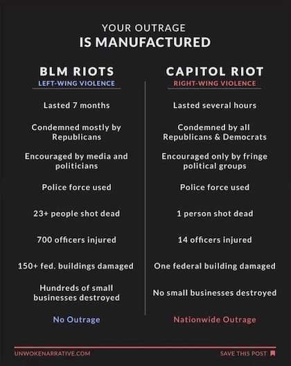 First up, Biden, Kamalaa and their MSM shills…along with every other Libtard frequenting Facebook and/or Twitter…are all indignant over the supposed disparity in treatment accorded the Black Lie Matters rioters following George Floyd’s death-by-fentanyl and those who assaulted the Capitol last Wednesday: